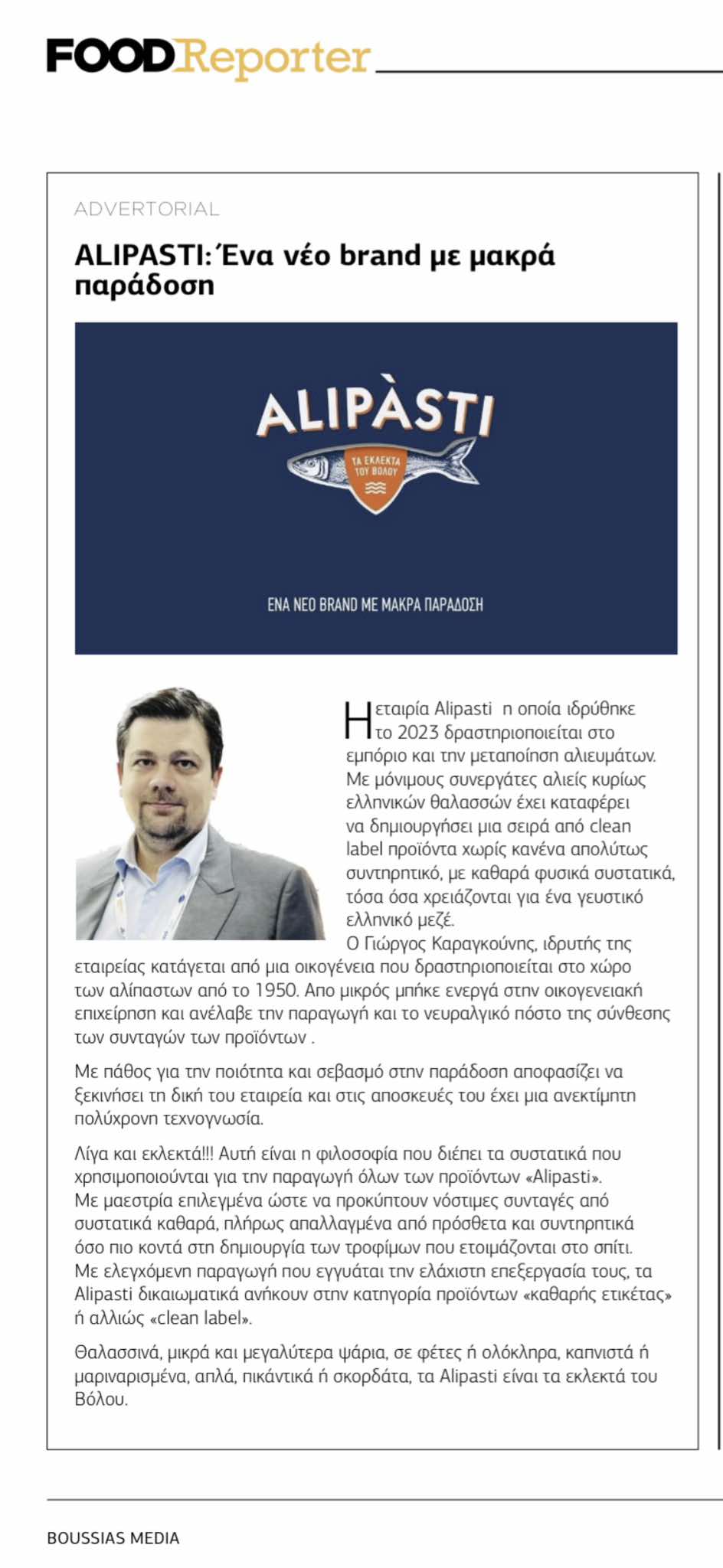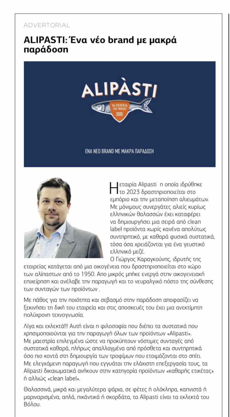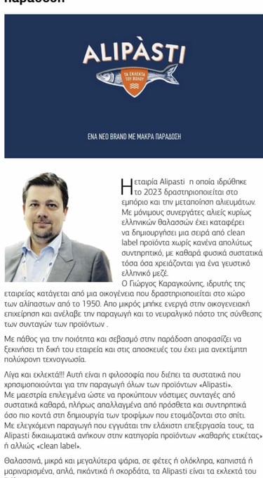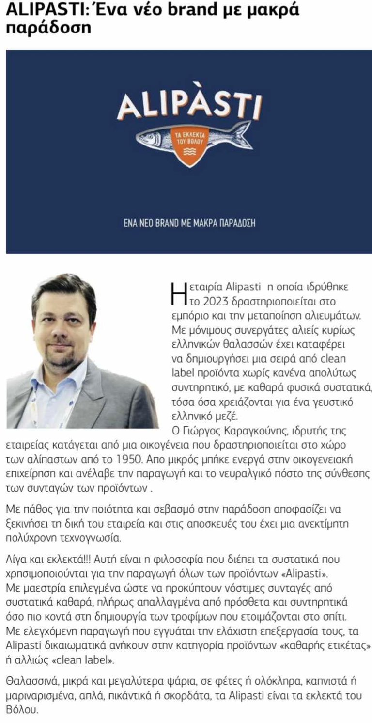 On November 20, 2024, Alipasti was honored to be featured in an article by the esteemed magazine Food Reporter, showcasing the company's philosophy and products. The article focused on the company's core values, commitment to quality and tradition, and the creation of a "clean label" product line free of preservatives and additives. It also highlighted the story and vision of the founder, George Karagounis, whose passion and innovation are steering Alipasti toward new horizons of flavor. This publication represents a significant recognition for our company, reaffirming our efforts to bring "the finest from Volos" into every home.