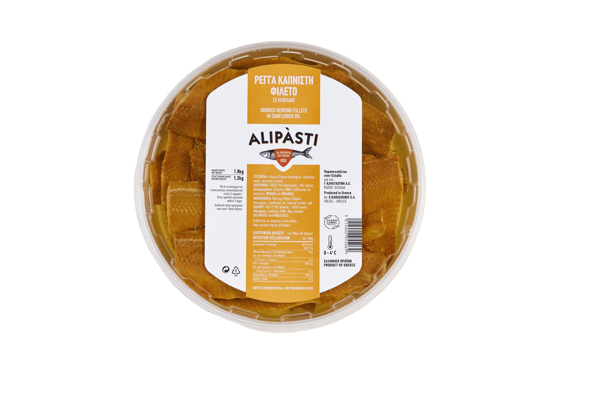 INGREDIENTS: Herring fillets (Clupea Harengus) sunflower oil , natural smoke, salt.