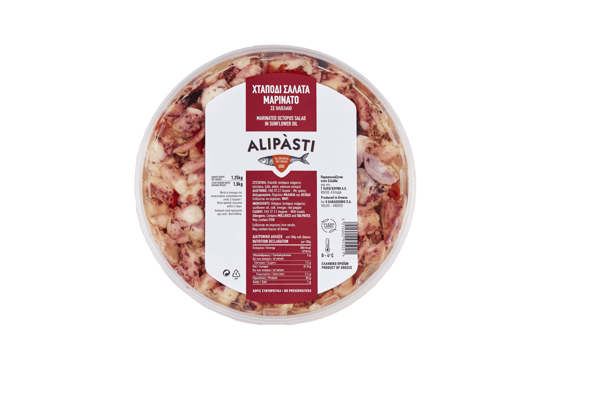 INGREDIENTS: Octopus (octopus vulgaris) sunflower oil , salt, vinegar, red pepper.